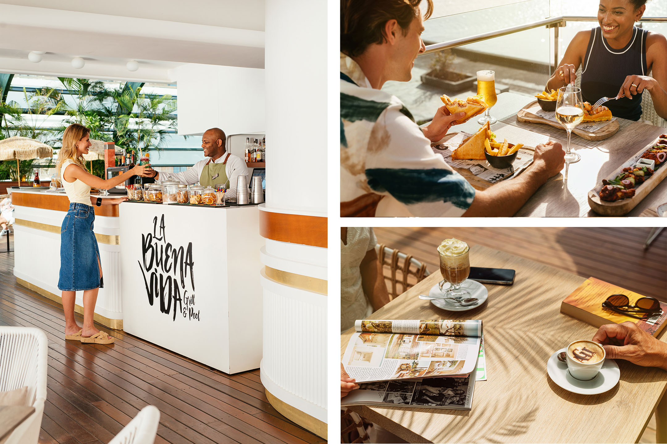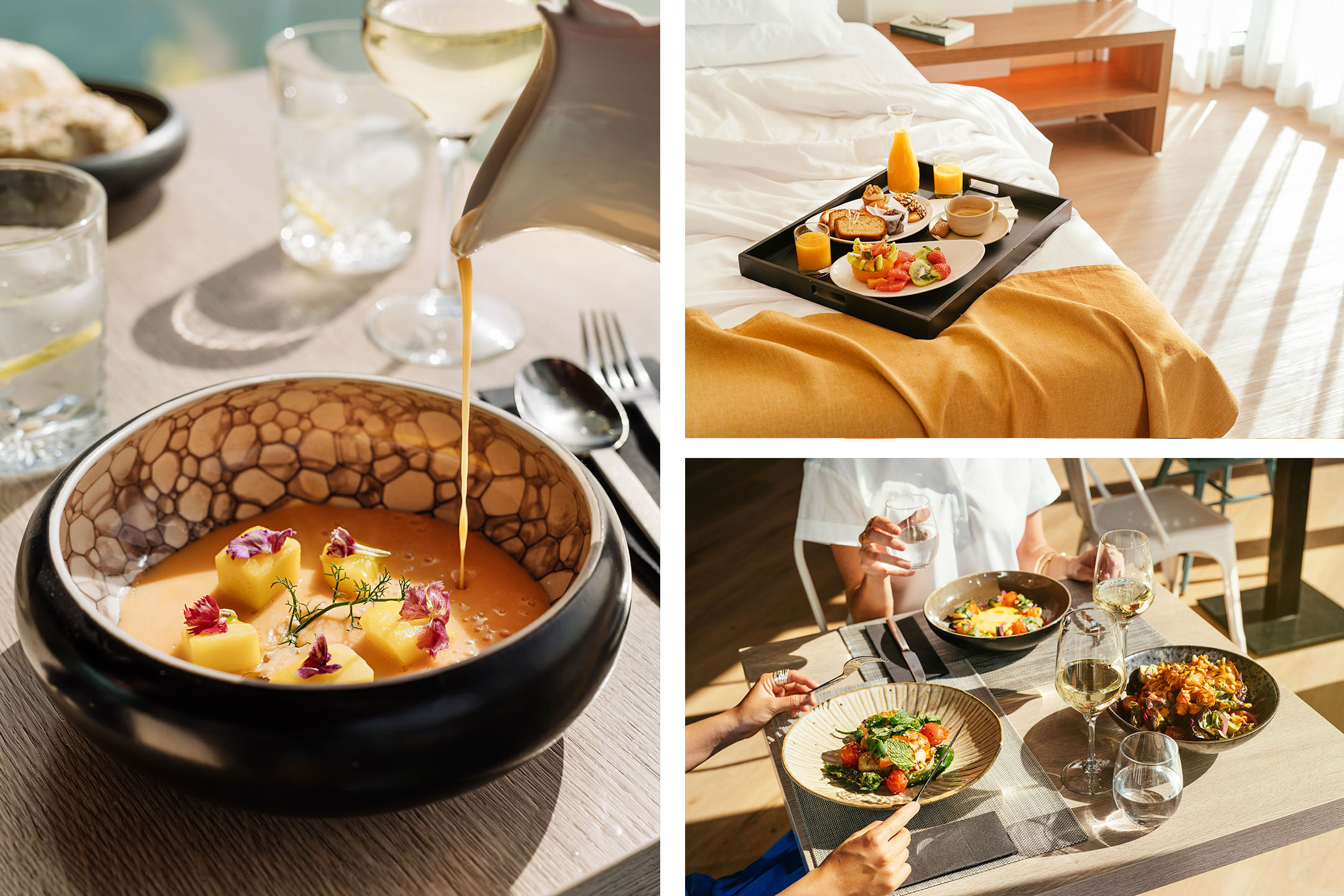 La gastronomía se trabajó como parte del recorrido del huésped dentro del hotel. Las imágenes del restaurante y del servicio amplían la lectura del proyecto arquitectónico e incorporan una dimensión experiencial que refuerza la identidad del conjunto.